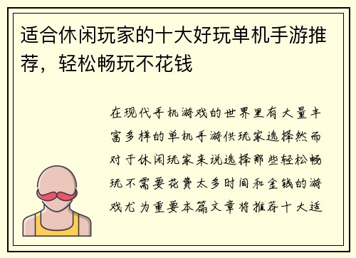 适合休闲玩家的十大好玩单机手游推荐,轻松畅玩不花钱